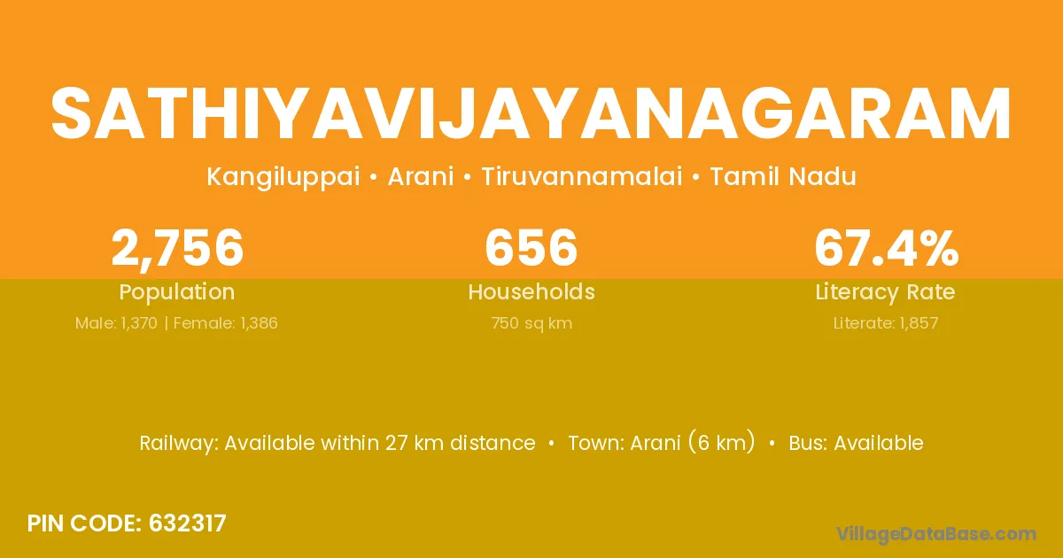 Arani (6 km) is the nearest town to Sathiyavijayanagaram village for major economic activities and is located approximately 6 km away.