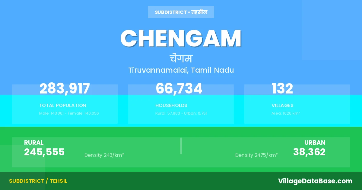 According to the 2011 census The total area of Chengam Taluka is 1026 km², with a population of 283917 people. The population density is 277 inhabitants per square kilometre, and there are approximately 66734 houses in the sub district.