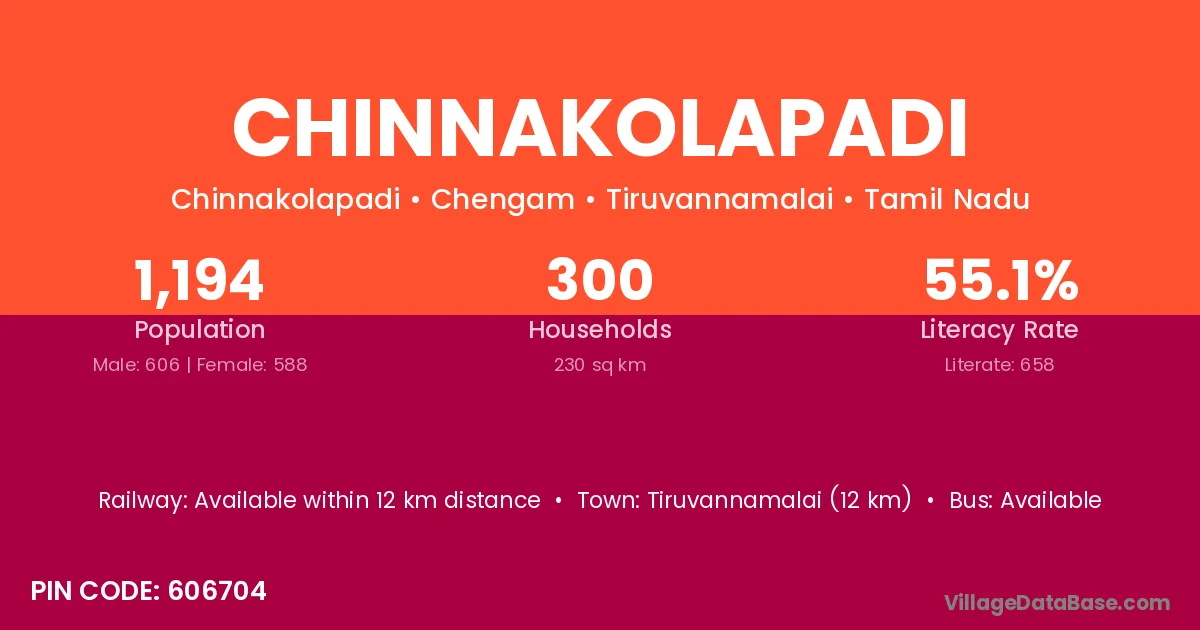 Chinnakolapadi village has a total population of 1,194 people, of which 606 are males and 588 are females.
