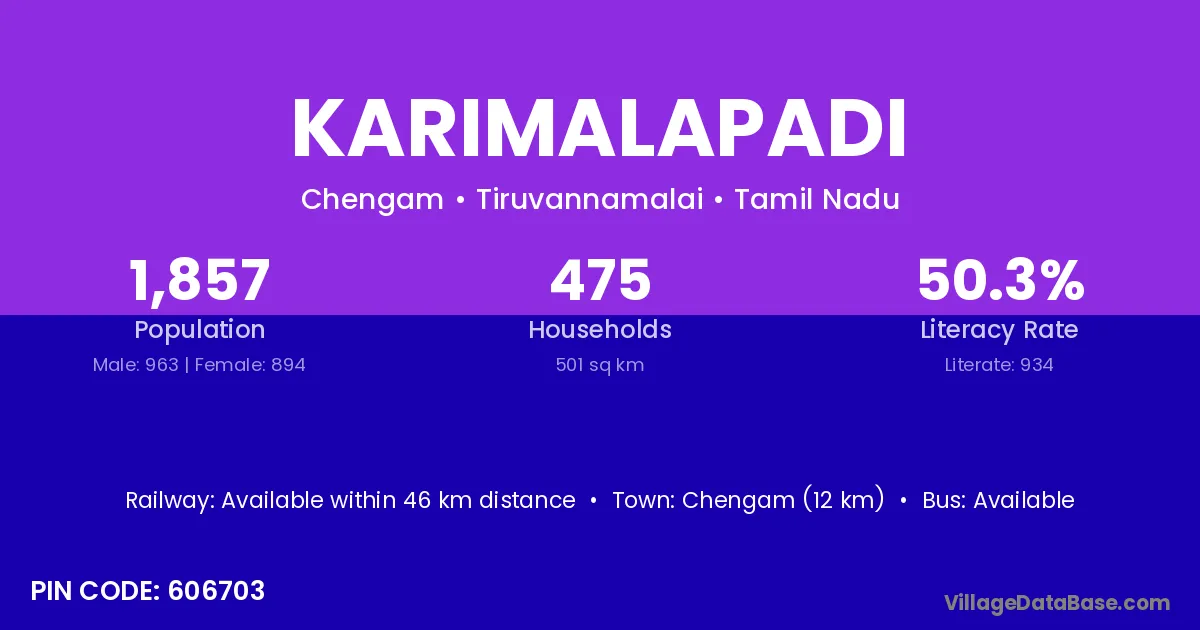 Chengam (12 km) is the nearest town to Karimalapadi village for major economic activities and is located approximately 12 km away.