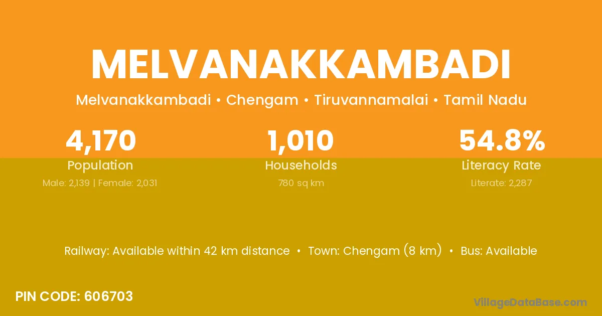 Chengam (8 km) is the nearest town to Melvanakkambadi village for major economic activities and is located approximately 8 km away.