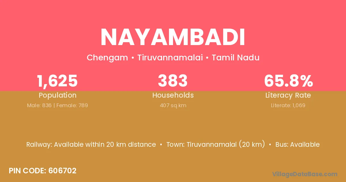 Tiruvannamalai (20 km) is the nearest town to Nayambadi village for major economic activities and is located approximately 20 km away.