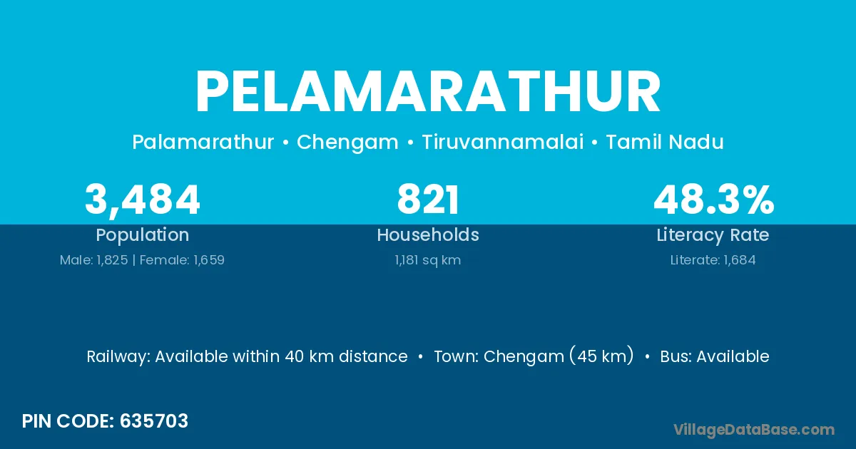 Chengam (45 km) is the nearest town to Pelamarathur village for major economic activities and is located approximately 45 km away.