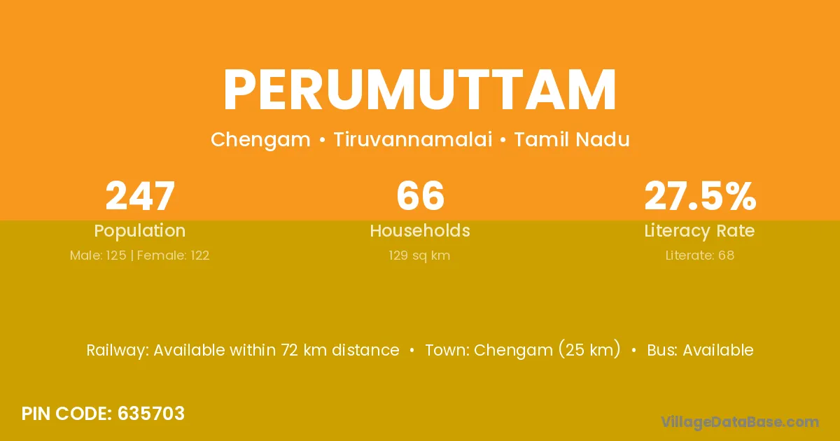 Chengam (25 km) is the nearest town to Perumuttam village for major economic activities and is located approximately 25 km away.