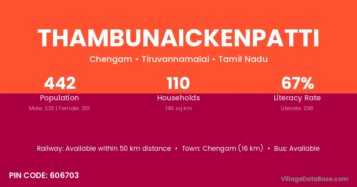 Chengam (16 km) is the nearest town to Thambunaickenpatti village for major economic activities and is located approximately 16 km away.