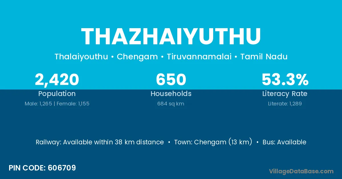Chengam (13 km) is the nearest town to Thazhaiyuthu village for major economic activities and is located approximately 13 km away.
