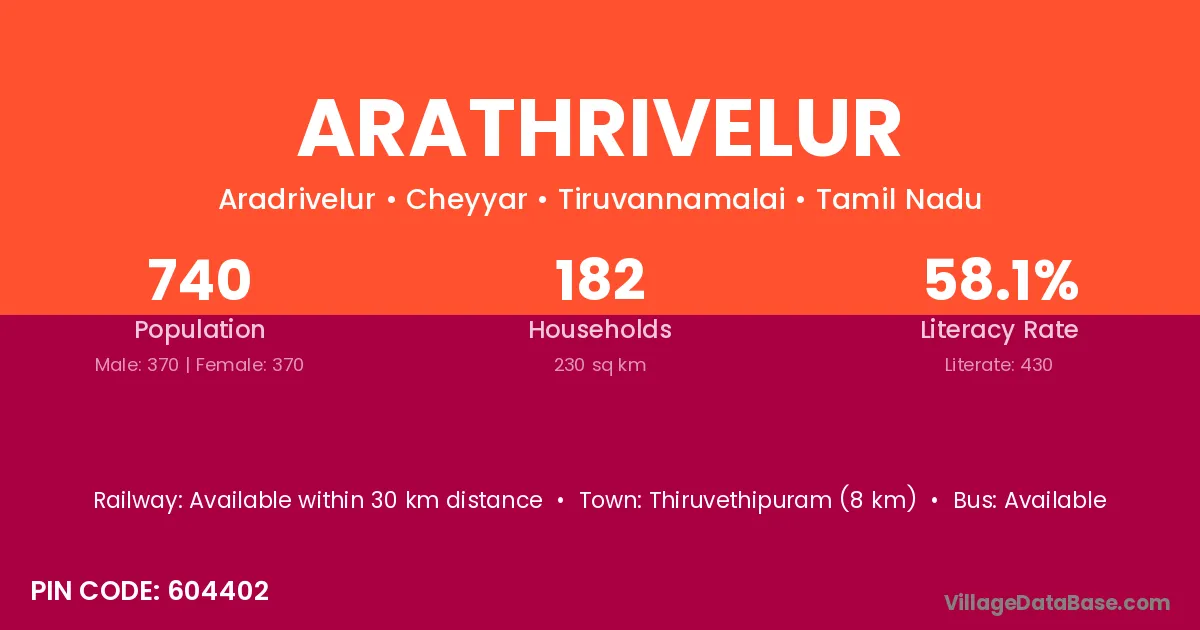 Arathrivelur village has a total population of 740 people, of which 370 are males and 370 are females.
