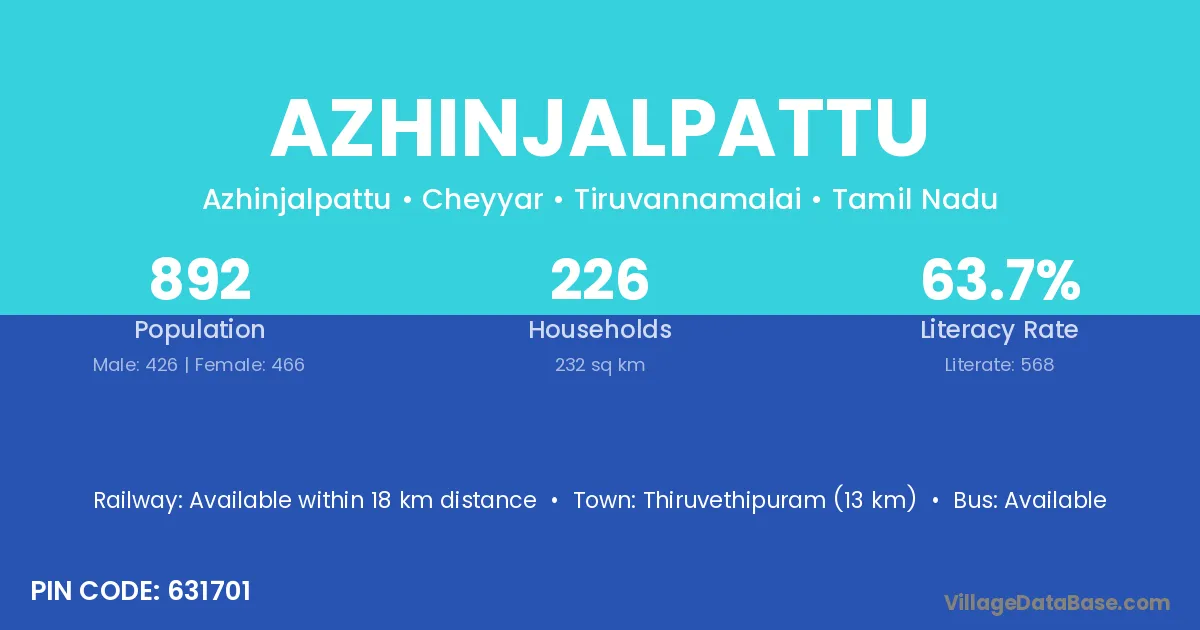 Thiruvethipuram (13 km) is the nearest town to Azhinjalpattu village for major economic activities and is located approximately 13 km away.
