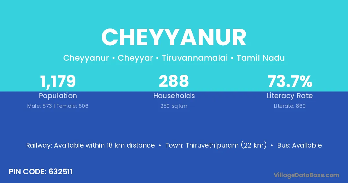 Thiruvethipuram (22 km) is the nearest town to Cheyyanur village for major economic activities and is located approximately 22 km away.
