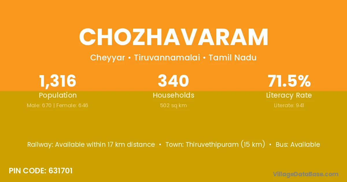 Thiruvethipuram (15 km) is the nearest town to Chozhavaram village for major economic activities and is located approximately 15 km away.