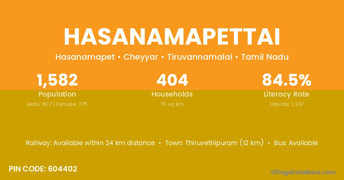 Thiruvethipuram (12 km) is the nearest town to Hasanamapettai village for major economic activities and is located approximately 12 km away.