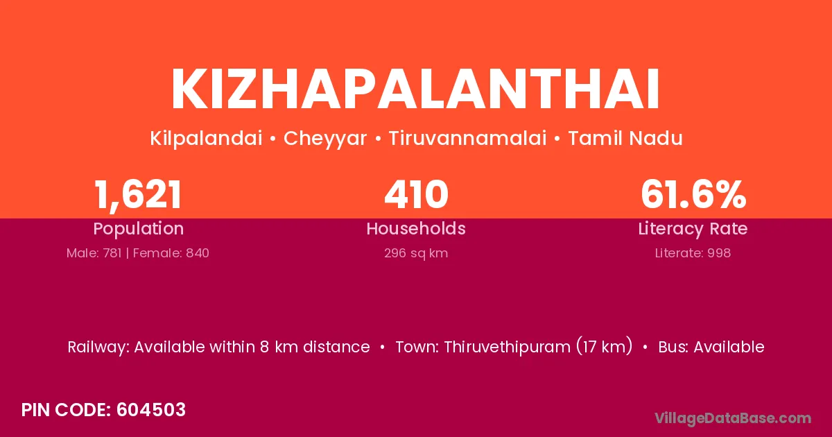 Kizhapalanthai village has a total population of 1,621 people, of which 781 are males and 840 are females.