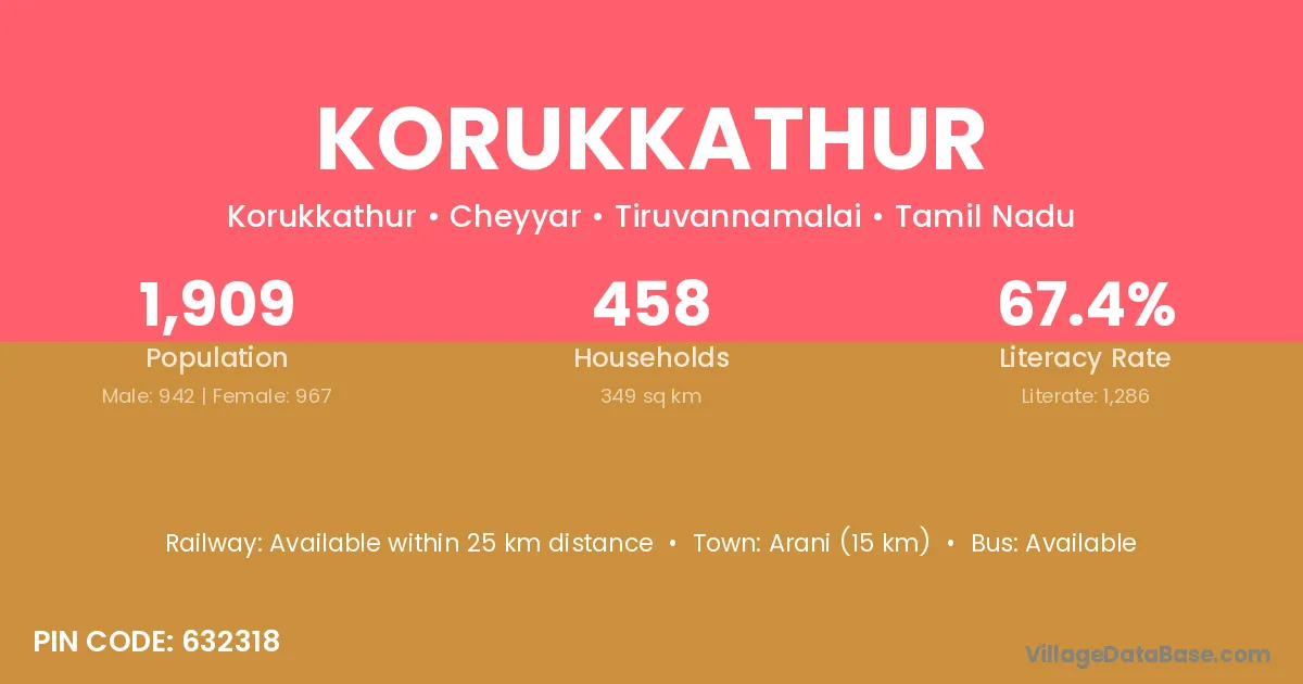Arani (15 km) is the nearest town to Korukkathur village for major economic activities and is located approximately 15 km away.