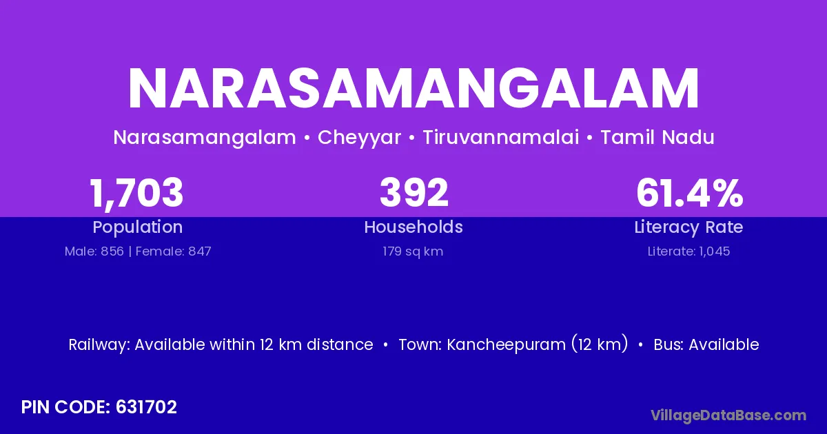 Kancheepuram (12 km) is the nearest town to Narasamangalam village for major economic activities and is located approximately 12 km away.