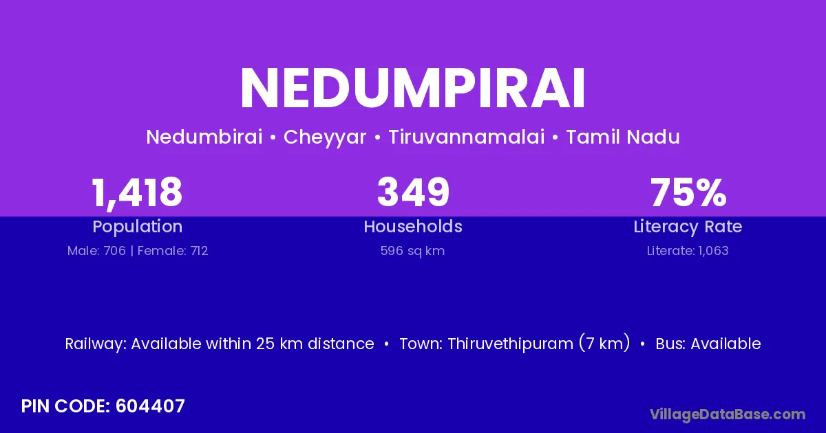 Thiruvethipuram (7 km) is the nearest town to Nedumpirai village for major economic activities and is located approximately 7 km away.