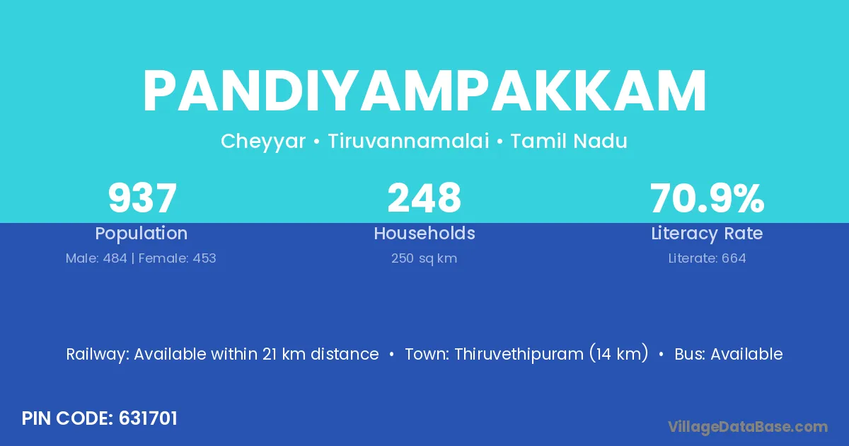 Pandiyampakkam village has a total population of 937 people, of which 484 are males and 453 are females.