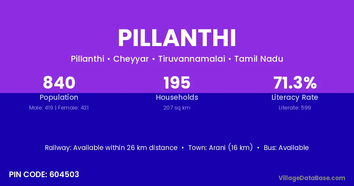 Arani (16 km) is the nearest town to Pillanthi village for major economic activities and is located approximately 16 km away.