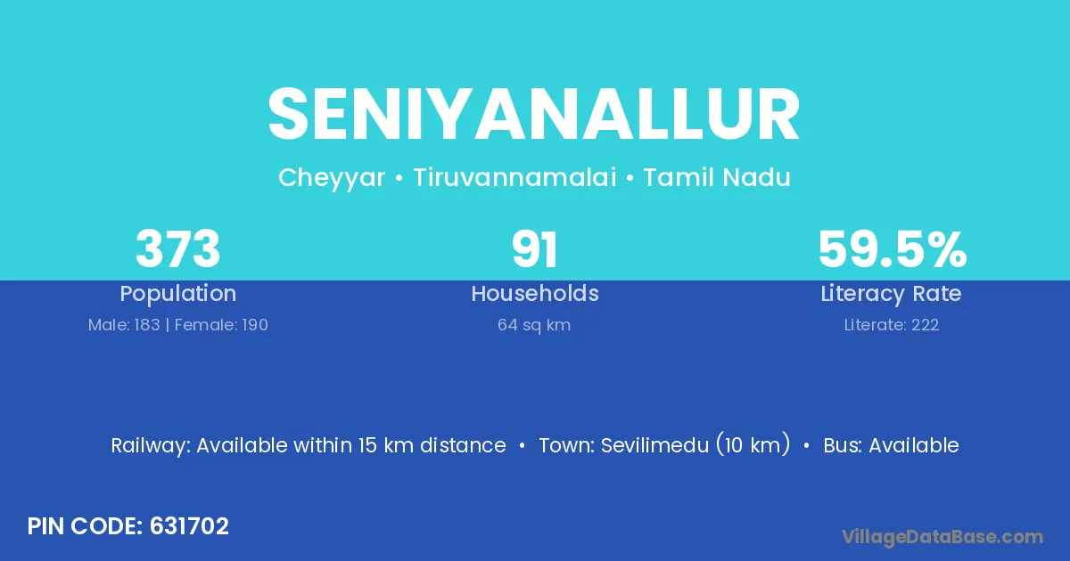 Sevilimedu (10 km) is the nearest town to Seniyanallur village for major economic activities and is located approximately 10 km away.