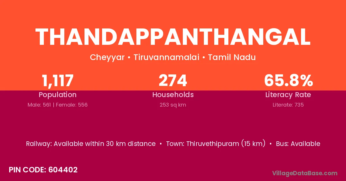 Thiruvethipuram (15 km) is the nearest town to Thandappanthangal village for major economic activities and is located approximately 15 km away.