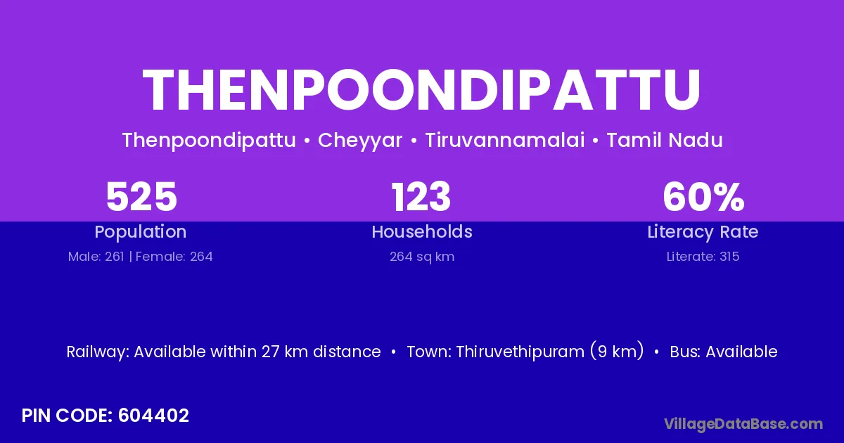 Thiruvethipuram (9 km) is the nearest town to Thenpoondipattu village for major economic activities and is located approximately 9 km away.