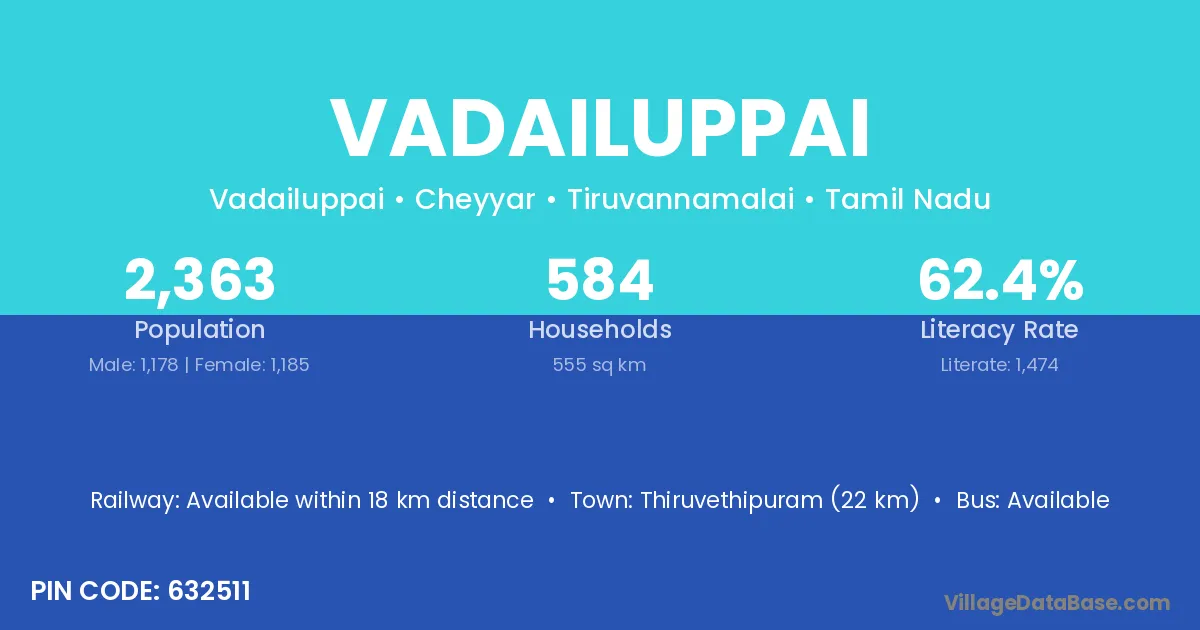 Thiruvethipuram (22 km) is the nearest town to Vadailuppai village for major economic activities and is located approximately 22 km away.