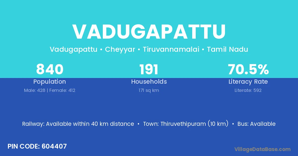 Thiruvethipuram (10 km) is the nearest town to Vadugapattu village for major economic activities and is located approximately 10 km away.