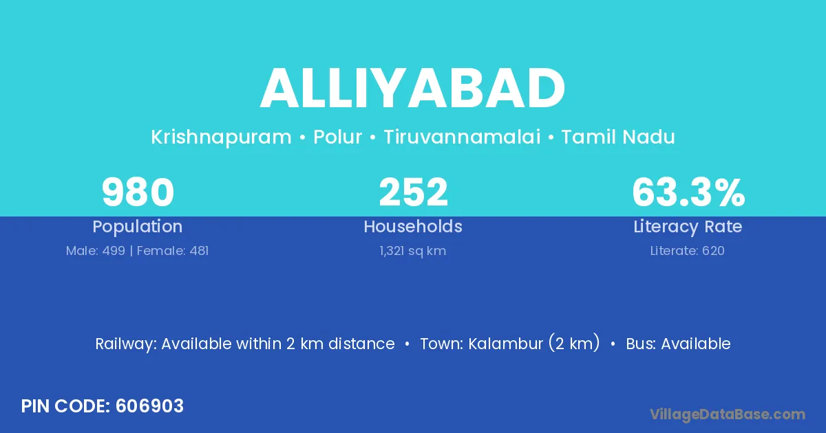 Kalambur (2 km) is the nearest town to Alliyabad village for major economic activities and is located approximately 2 km away.