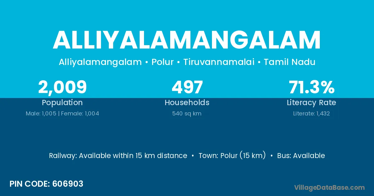 Polur (15 km) is the nearest town to Alliyalamangalam village for major economic activities and is located approximately 15 km away.