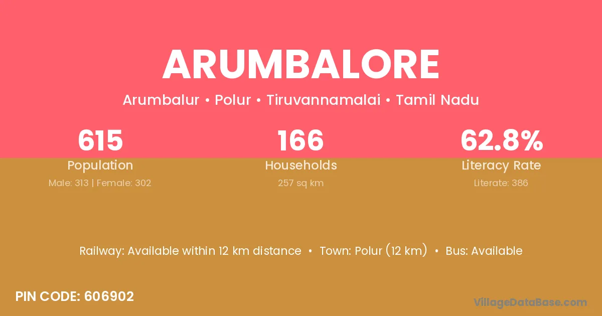 Polur (12 km) is the nearest town to Arumbalore village for major economic activities and is located approximately 12 km away.