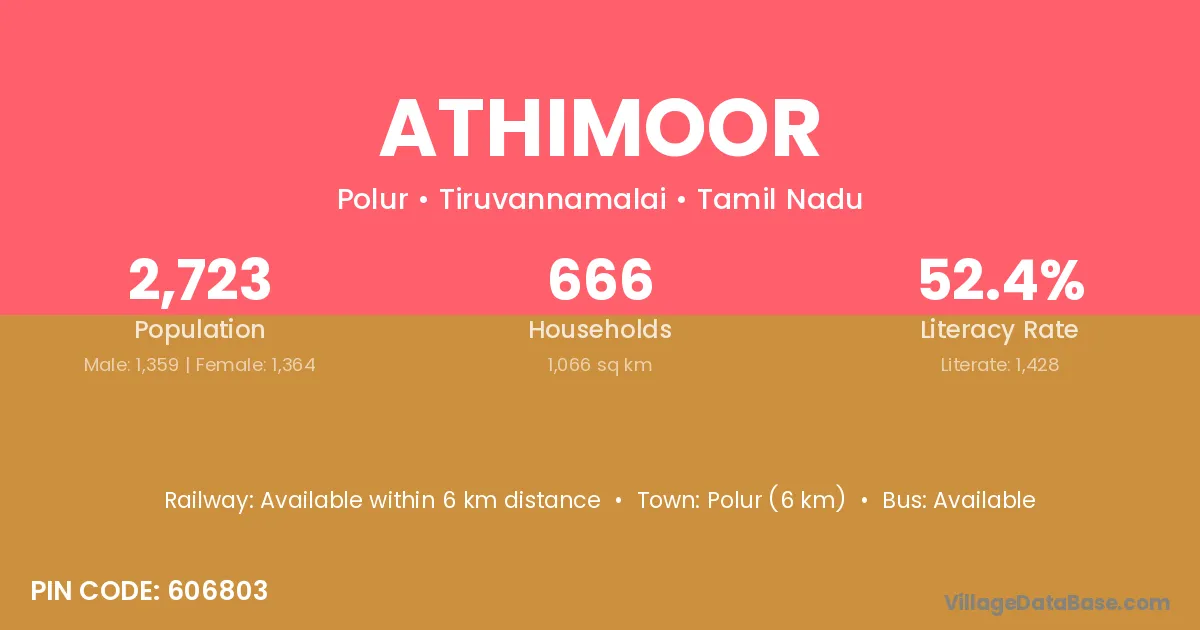 Polur (6 km) is the nearest town to Athimoor village for major economic activities and is located approximately 6 km away.