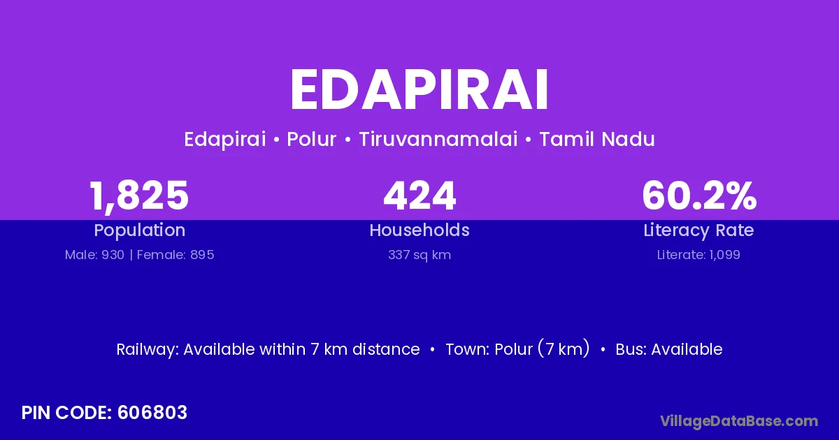Polur (7 km) is the nearest town to Edapirai village for major economic activities and is located approximately 7 km away.