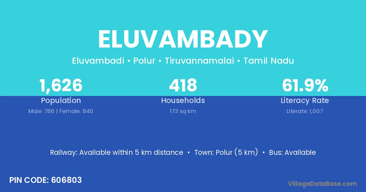 Polur (5 km) is the nearest town to Eluvambady village for major economic activities and is located approximately 5 km away.