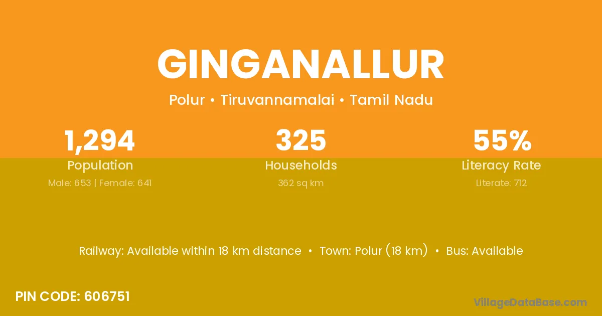 Polur (18 km) is the nearest town to Ginganallur village for major economic activities and is located approximately 18 km away.