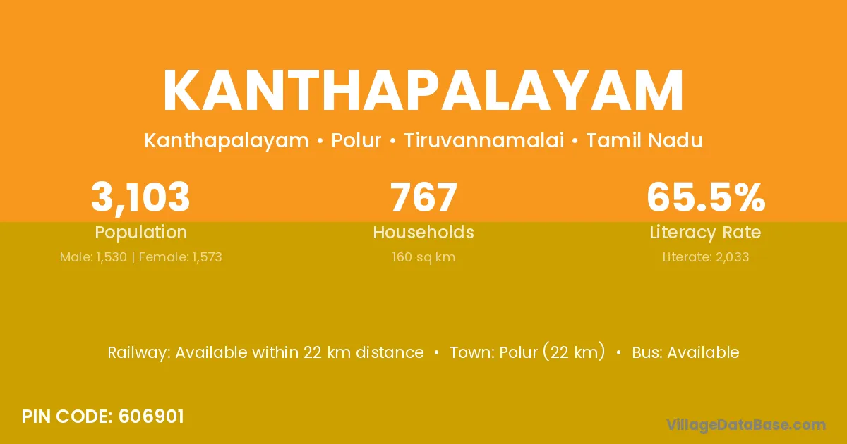 Polur (22 km) is the nearest town to Kanthapalayam village for major economic activities and is located approximately 22 km away.