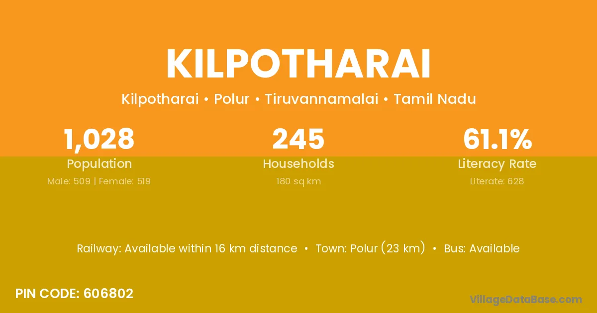 Polur (23 km) is the nearest town to Kilpotharai village for major economic activities and is located approximately 23 km away.