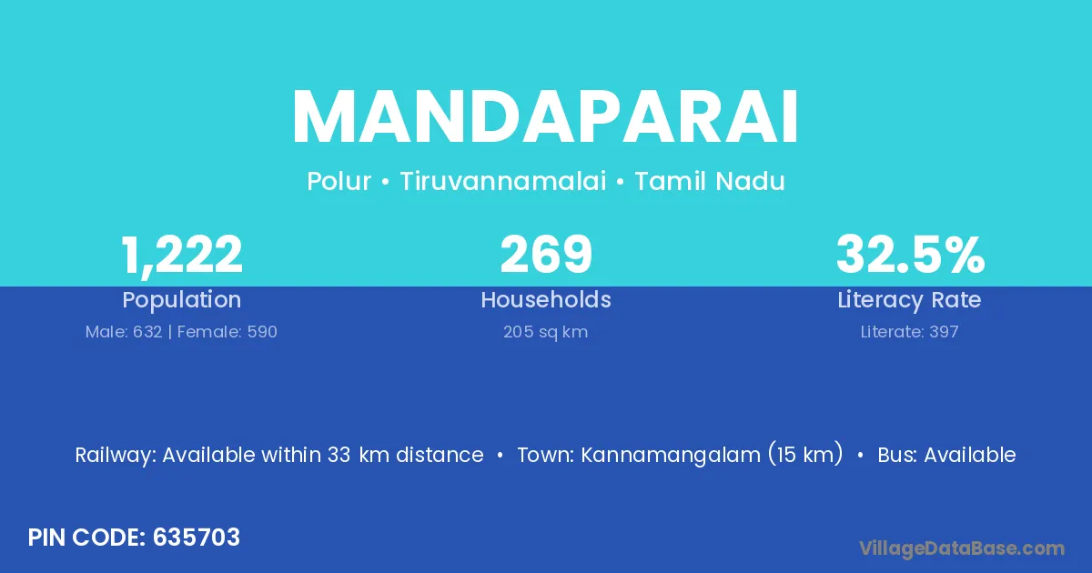 Mandaparai village has a total population of 1,222 people, of which 632 are males and 590 are females.