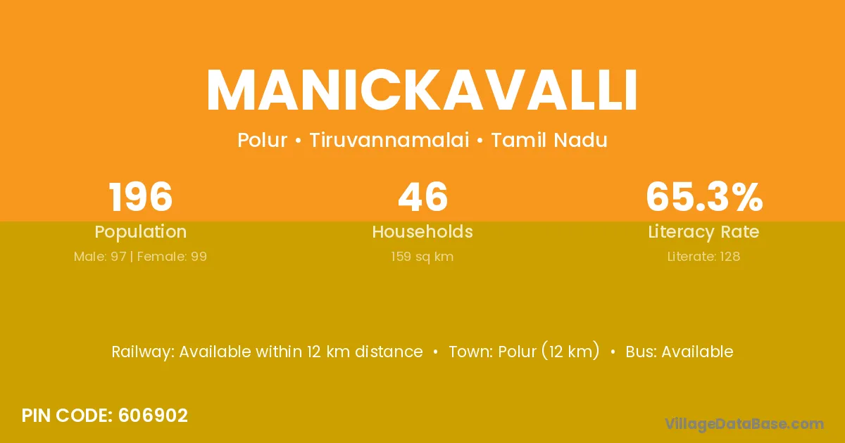 Polur (12 km) is the nearest town to Manickavalli village for major economic activities and is located approximately 12 km away.