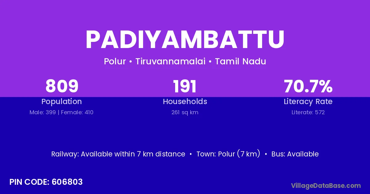 Polur (7 km) is the nearest town to Padiyambattu village for major economic activities and is located approximately 7 km away.