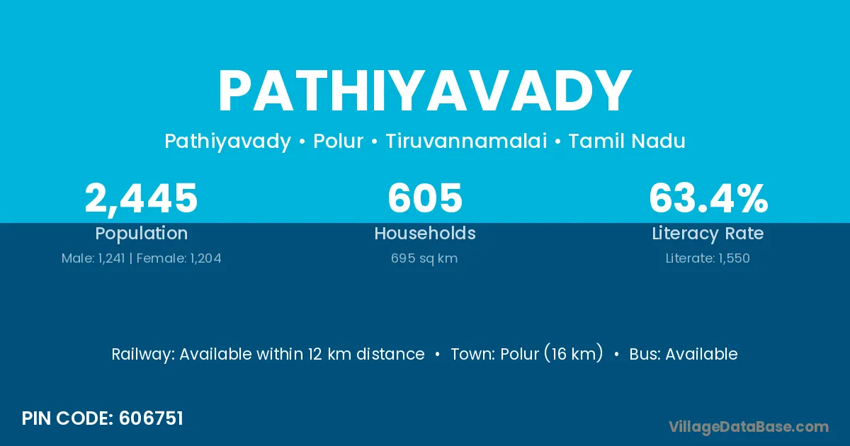 Polur (16 km) is the nearest town to Pathiyavady village for major economic activities and is located approximately 16 km away.