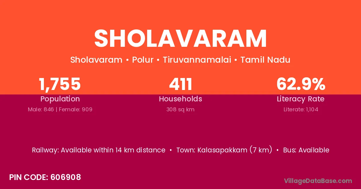 Kalasapakkam (7 km) is the nearest town to Sholavaram village for major economic activities and is located approximately 7 km away.