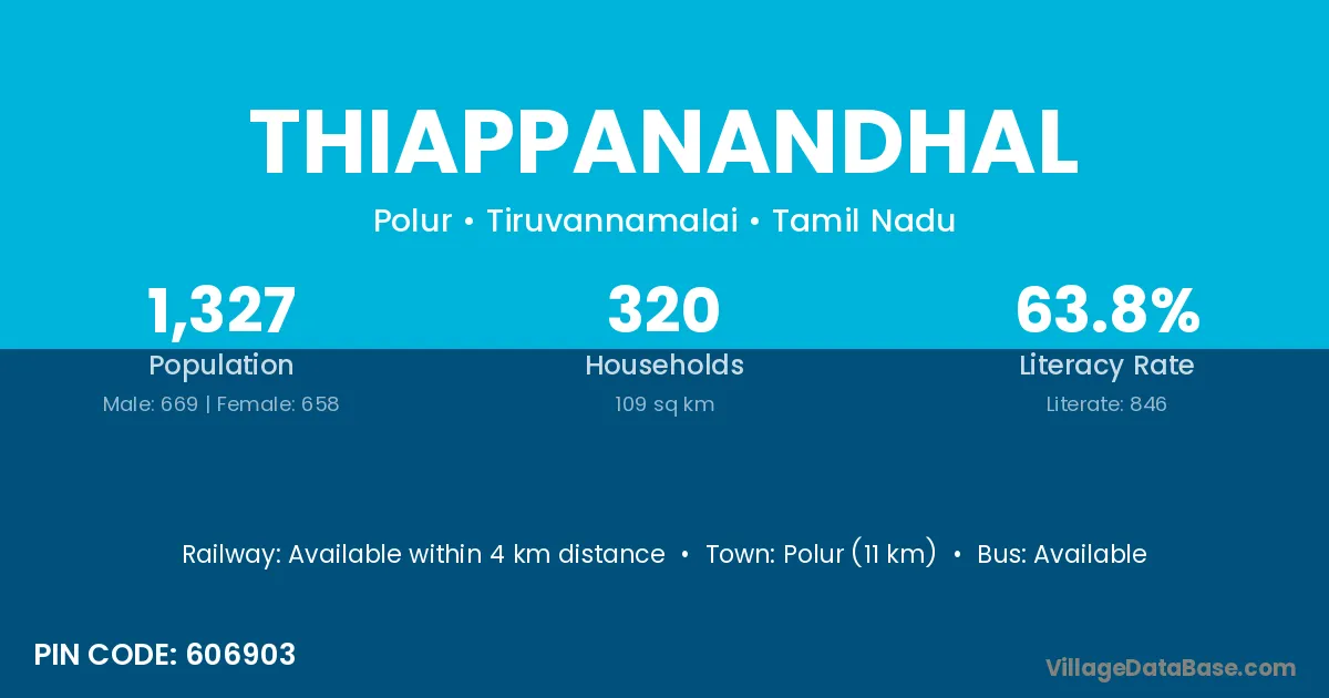 Polur (11 km) is the nearest town to Thiappanandhal village for major economic activities and is located approximately 11 km away.