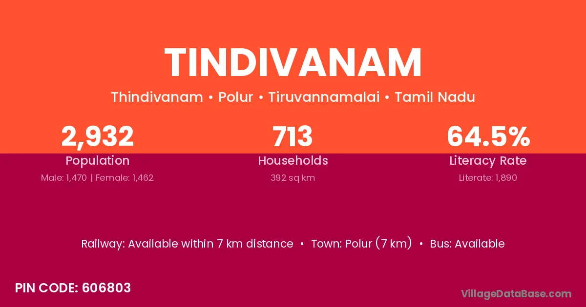 Tindivanam village has a total population of 2,932 people, of which 1,470 are males and 1,462 are females.