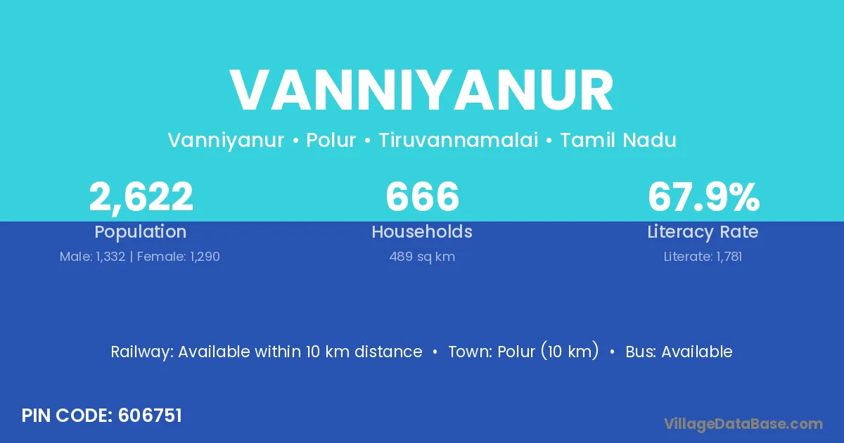 Polur (10 km) is the nearest town to Vanniyanur village for major economic activities and is located approximately 10 km away.