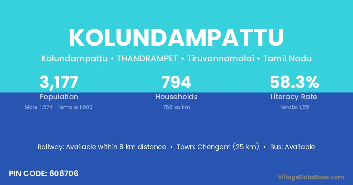 Kolundampattu village has a total population of 3,177 people, of which 1,574 are males and 1,603 are females.