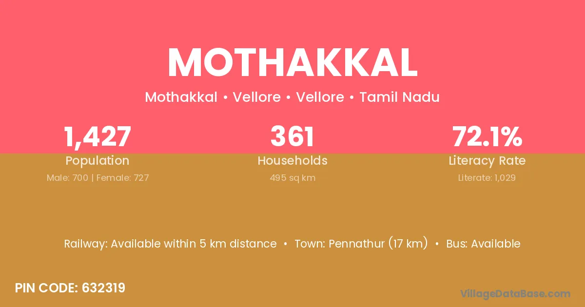 Mothakkal village has a total population of 3,279 people, of which 1,690 are males and 1,589 are females.