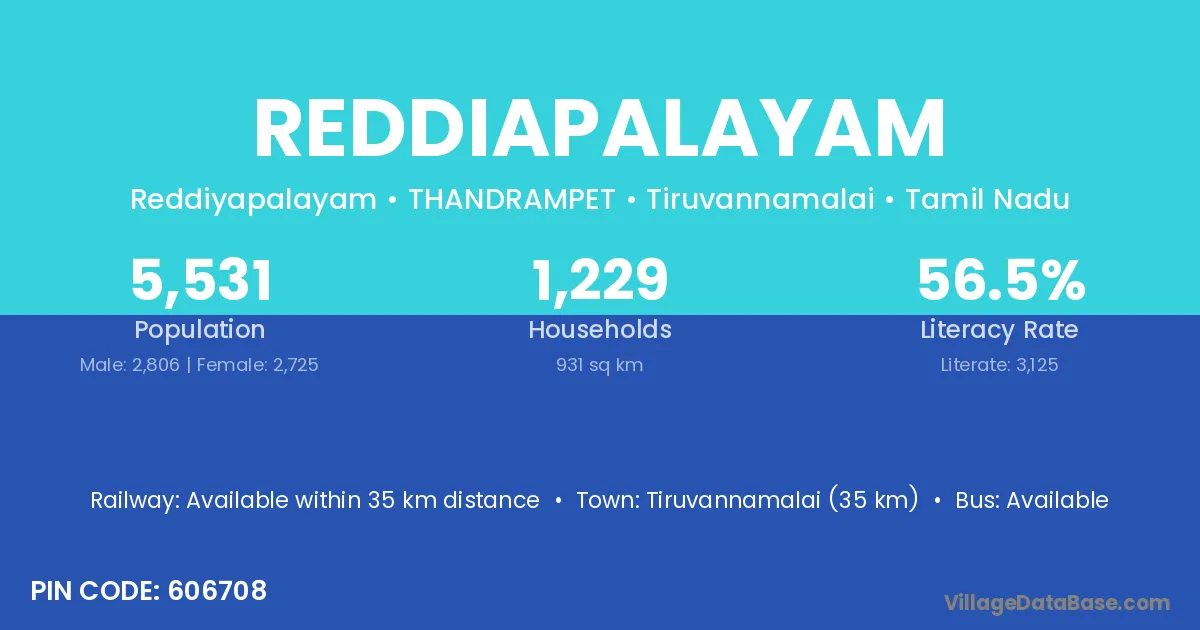 Tiruvannamalai (35 km) is the nearest town to Reddiapalayam village for major economic activities and is located approximately 35 km away.