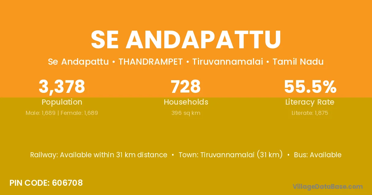 Se Andapattu village has a total population of 3,378 people, of which 1,689 are males and 1,689 are females.