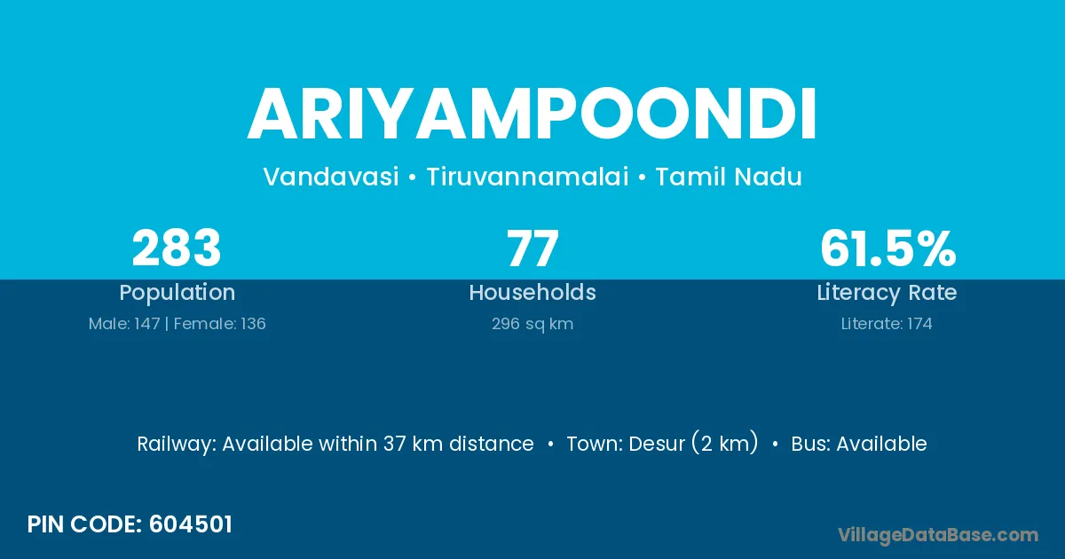 Ariyampoondi village has a total population of 283 people, of which 147 are males and 136 are females.