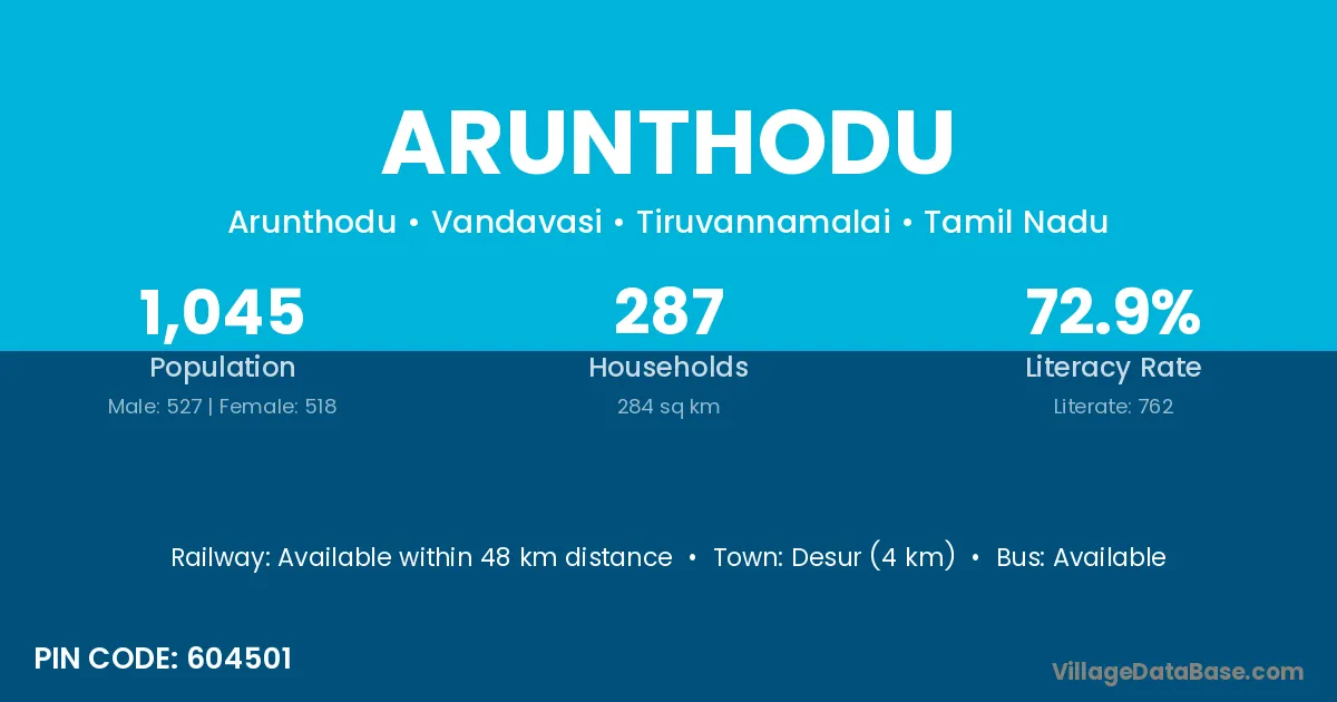 Arunthodu village has a total population of 1,045 people, of which 527 are males and 518 are females.