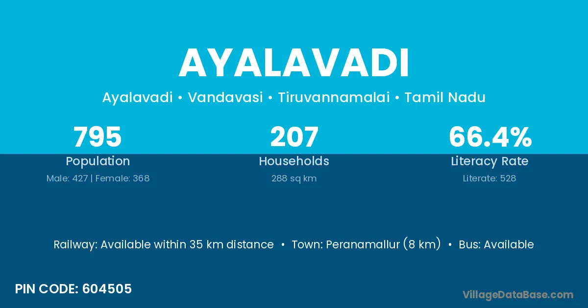 Peranamallur (8 km) is the nearest town to Ayalavadi village for major economic activities and is located approximately 8 km away.